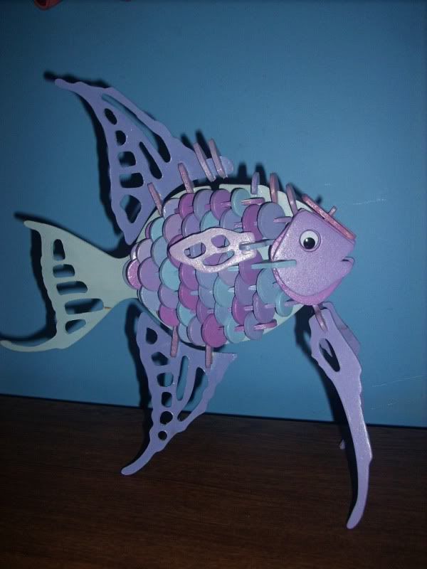 My angelfish. First one I made. I thought it was pretty but sort of plain just wooden. So I bought some paint and painted it. With this one I took it apart and painted each peice. The scales are many different shades and both sides are in the same order. I made sure of that. Unfortunately this one was drop and one of the peices broke. It is fixed but stands crooked now. Still my fave. Only one I put a finish on so far too, so it shines.